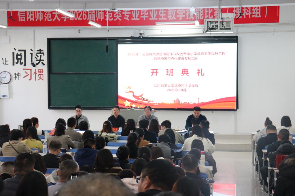 10月31日上午9时,信阳师范大学crown皇冠体育平台在社科楼121教室举行2025年“义务教育师资薄弱环节改善暨中小学教师素质提升工程”师德师风常态化建设专项培训开班典礼。crown皇冠体育平台副院长周智、常文涛,班主任代表赵子剑出席典礼,来自省内的190余名参训教师共同参会。本次典礼由crown皇冠体育平台副院长常文涛主持。