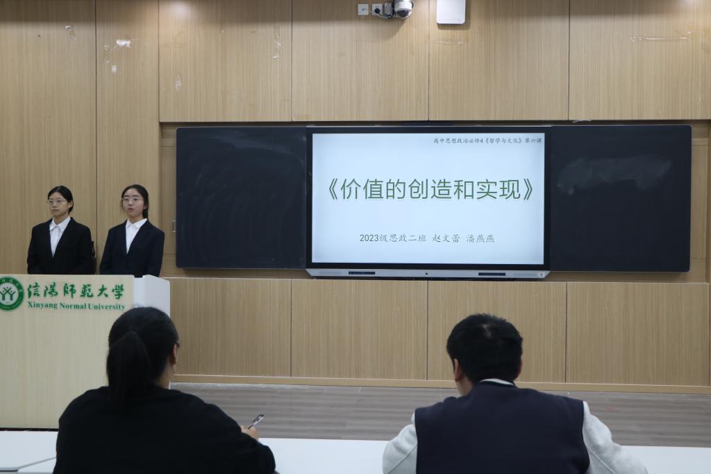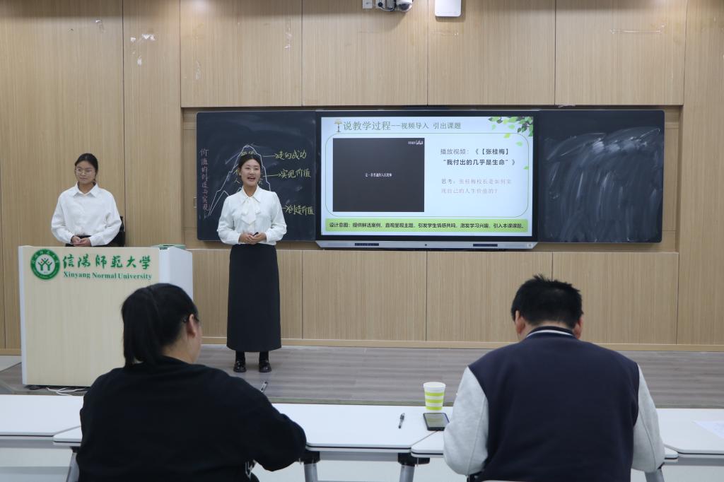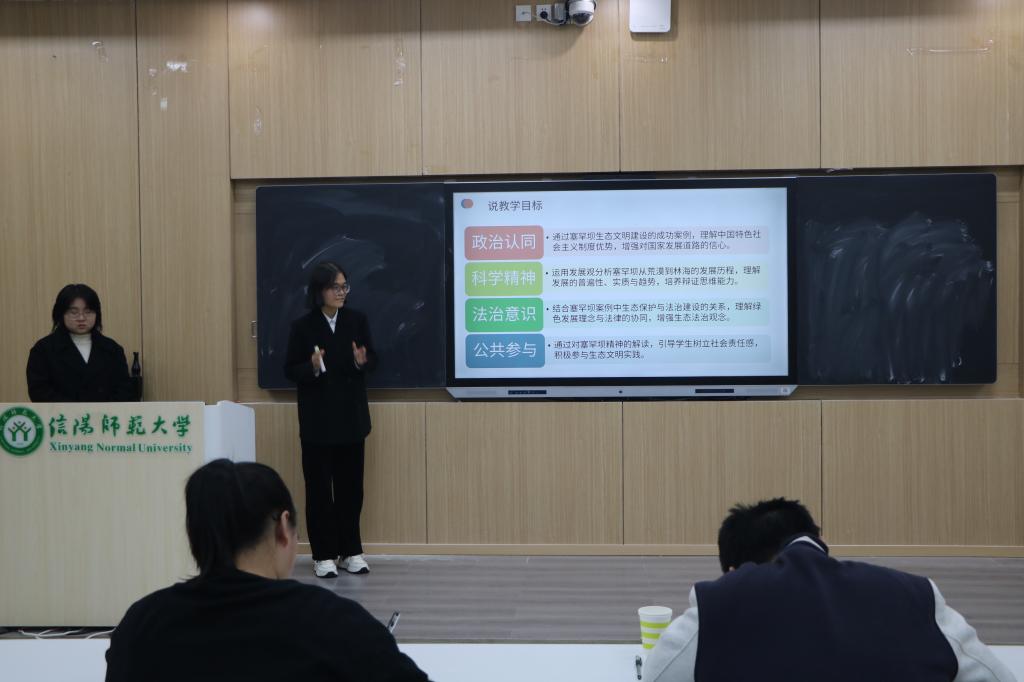 比赛现场,七组选手围绕思政课教学内容,从教学分析、教学策略、教学过程、板书设计及教学反思等多个环节进行系统阐述,体现出“以学生为中心”的教学理念。第五组以“价值的创造与实现”为题,徐曼珍和孙爱悦同学从教材分析、学情分析、教法学法等方面深入分析课程内容,通过多媒体互动、情景模拟等多元化教学手段,让评委和观众眼前一亮,取得佳绩。第一组孔晓宇同学以“习近平新时代中国特色社会主义思想”为题,从说教材、说学情、说目标等五个方面展开,引导同学们深入思考和自主探究,为现场带来一场精彩的演说。第七组冯源同学以"坚持以人民为中心——从'十四个坚持'学起习近平新时代中国特色社会主义思想"为主题,通过精心的教学设计和生动的案例讲解,展现了良好的教学素养。