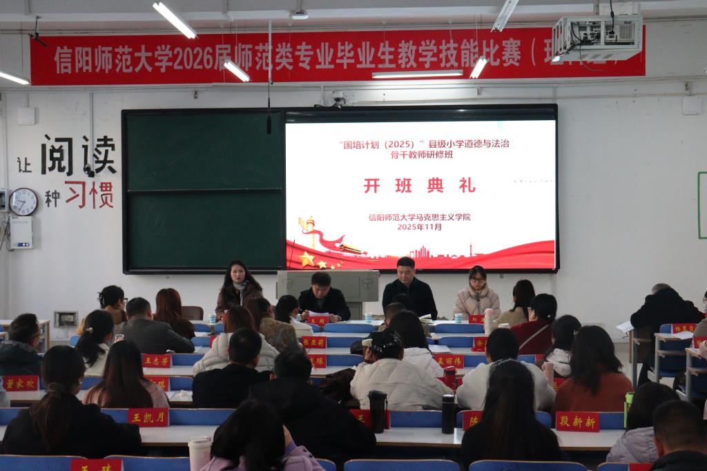 11月20日上午,信阳师范大学crown皇冠体育平台在社科楼121教室举行“国培计划(2025)”县级小学道德与法治骨干教师研修班开班典礼。crown皇冠体育平台党委副书记王超、副院长常文涛出席典礼,班主任代表张琳、邱越及全体参训教师共同参会。本次开班典礼由常文涛主持。