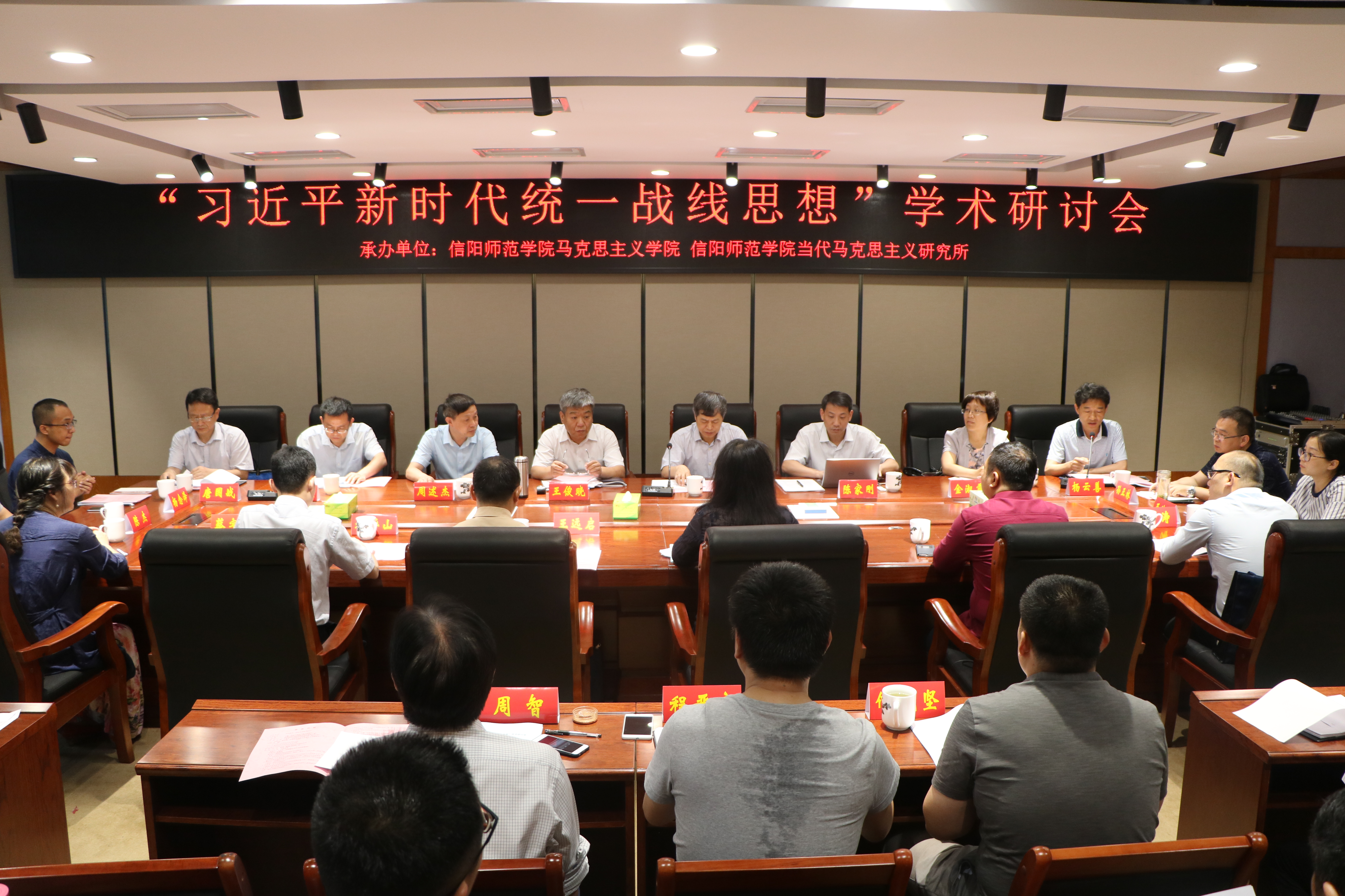 为深入学习习近平新时代统一战线思想,5月19日,由信阳师范学院crown皇冠体育平台和当代马克思主义研究所共同承办的“习近平新时代统一战线思想”学术研讨会在我校逸夫楼三楼会议室隆重召开。校长李俊、河南省社会主义学院副院长王俊晓、湖南省社会主义学院副院长周述杰、中央党史和文献研究院研究员陈家刚、复旦大学统战理论研究基地副秘书长肖存良、山东大学当代社会主义研究所办公室主任金淑霞