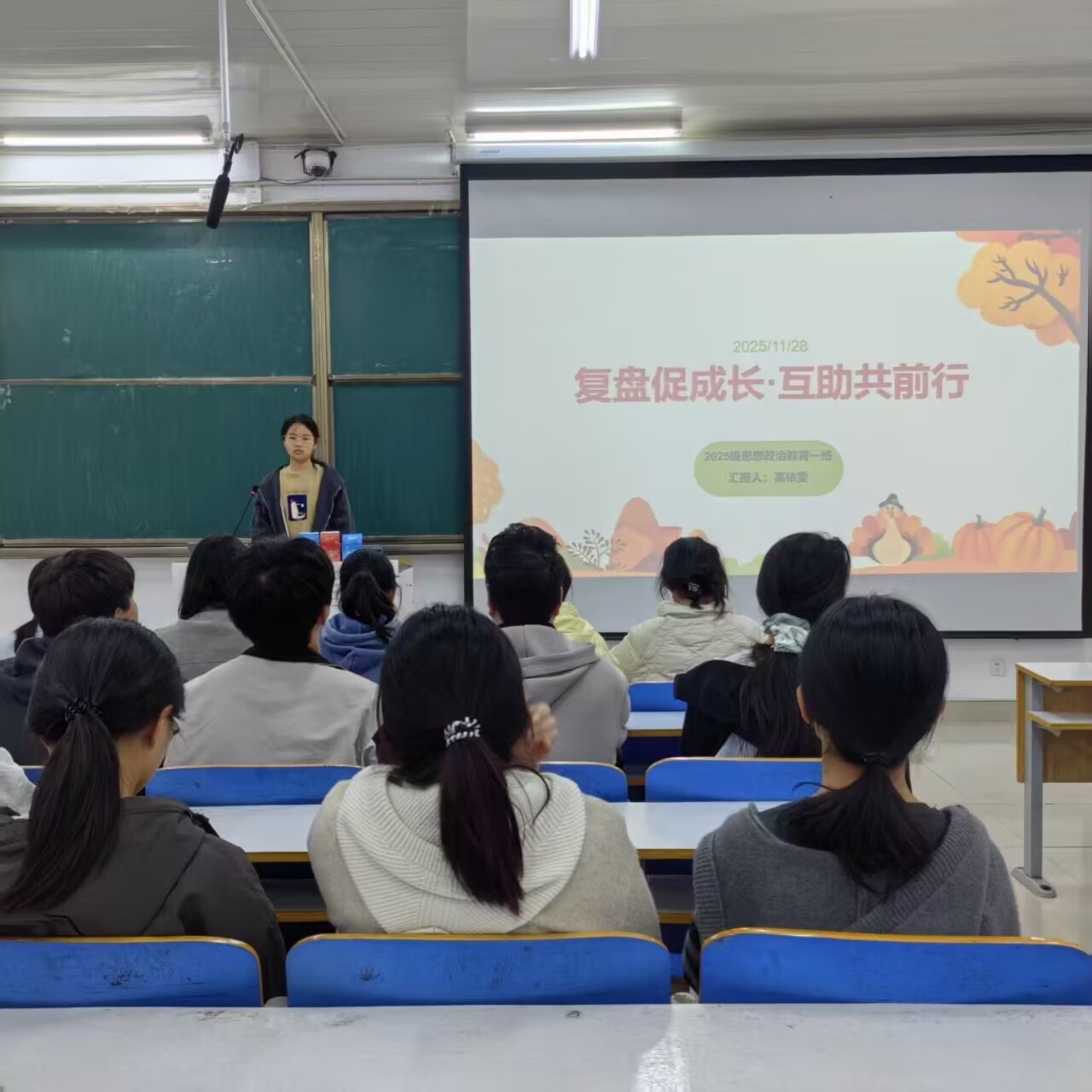 为破解“努力无方向、问题难解决”的现实困境,搭建互助共进的班级交流平台,11月28日上午,crown皇冠体育平台2025级思想政治教育一班在社科楼514开展“复盘促成长,互助共前行”主题班会。本次班会由班长高依雯主持,班级全体同学参加。
