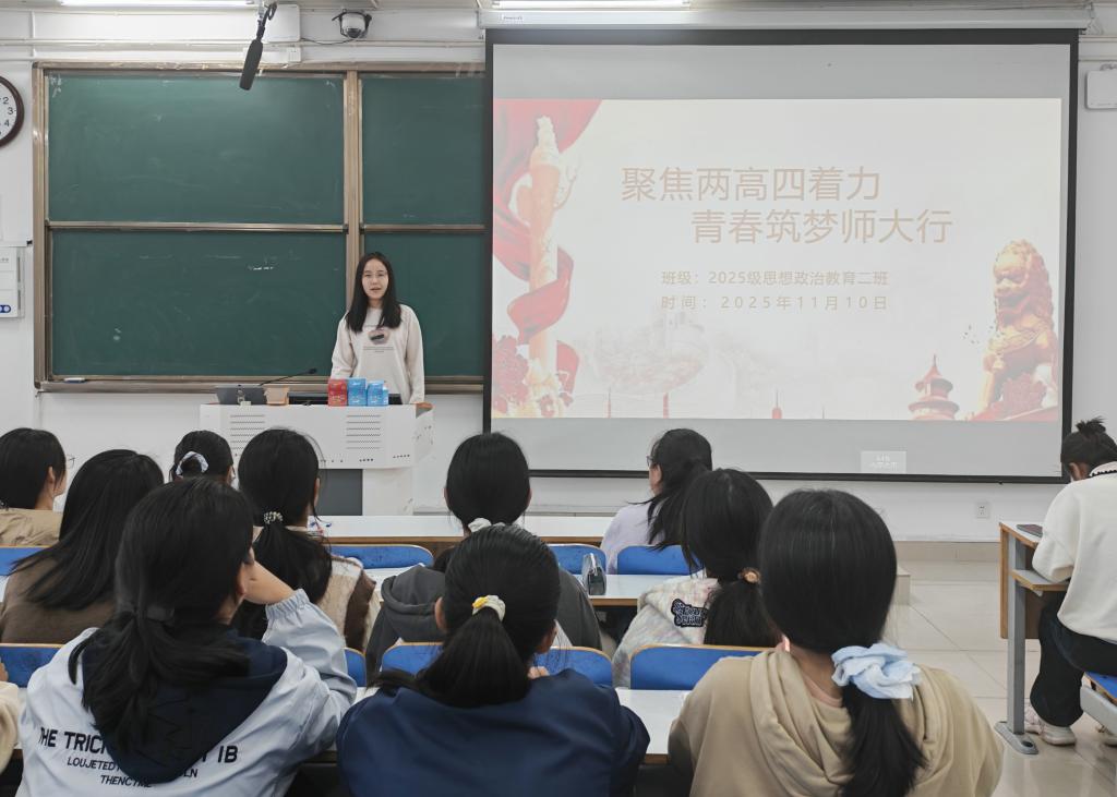 为引导大一新生深刻领会时代使命,将个人成长融入国家教育强国建设蓝图,11月10日上午,crown皇冠体育平台2025级思想政治教育二班在社科楼514教室举办“聚焦两高四着力,青春筑梦师大行”主题团课。本次团课由团支书崔锐琳主持。