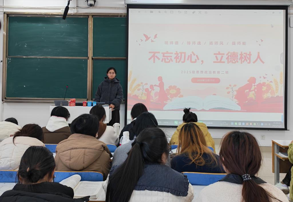 班会紧扣师德师风建设主题,陈曦组织同学们学习了《新时代高校教师职业行为十项准则》和《教育强国建设规划纲要(2025-2035年)》中关于师德建设的重要论述,并通过播放优秀人民教师、特别是思政课教师楷模的先进事迹短片,生动展现了“师魂”的时代内涵。随后,在“情境思辨”环节中,大家围绕教育教学与网络言行中的典型情境进行辨析讨论,进一步明确了行为规范与底线红线。接着,新颖的“师能提升快闪”环节,则引导同学们将理论认知转化为具体的行动承诺与技能提升计划。班会最后,陈曦总结强调,作为兼具“未来教师”与“青年马克思主义者”双重身份的思想政治教育专业学生,必须自觉将师德要求内化于心、外化于行,主动锤炼育人本领,坚决抵制不良倾向,以实际行动践行“立德树人”的根本任务。