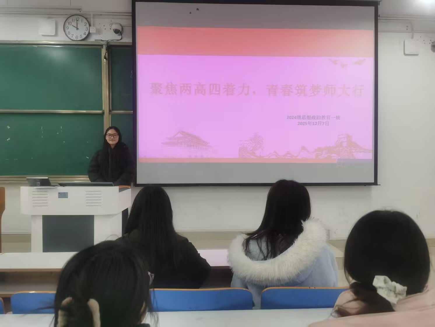 为深入领会“四高四着力”发展要求,凝聚我班学子奋进力量,12月7日上午,crown皇冠体育平台2024级思政一班于社科楼514教室开展“聚焦四高四着力,青春筑梦师大行”主题团课。本次团课由团支书李冉主持,一班全体同学参加。