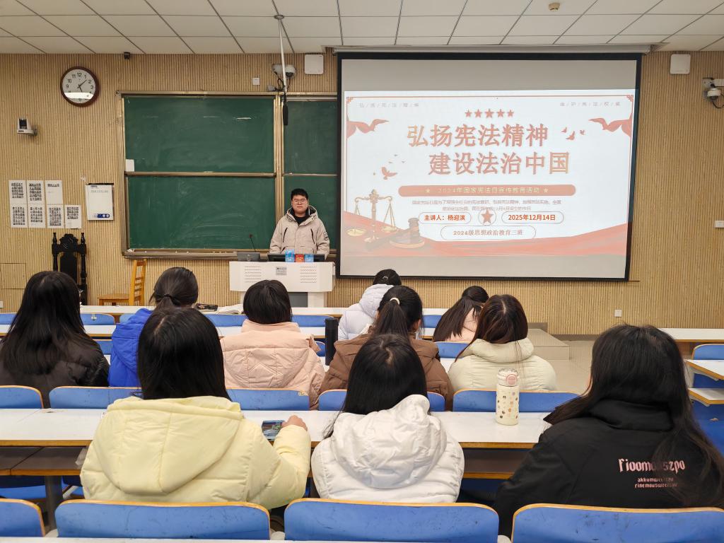 为深入学习贯彻习近平法治思想,引导青年学子增强宪法意识、树立法治观念,crown皇冠体育平台2024级思想政治教育三班于12月14日在社科楼515教室组织开展“弘扬宪法精神,建设法治中国”主题团课。班级成员齐聚一堂,共同学习宪法知识、感悟法治力量。