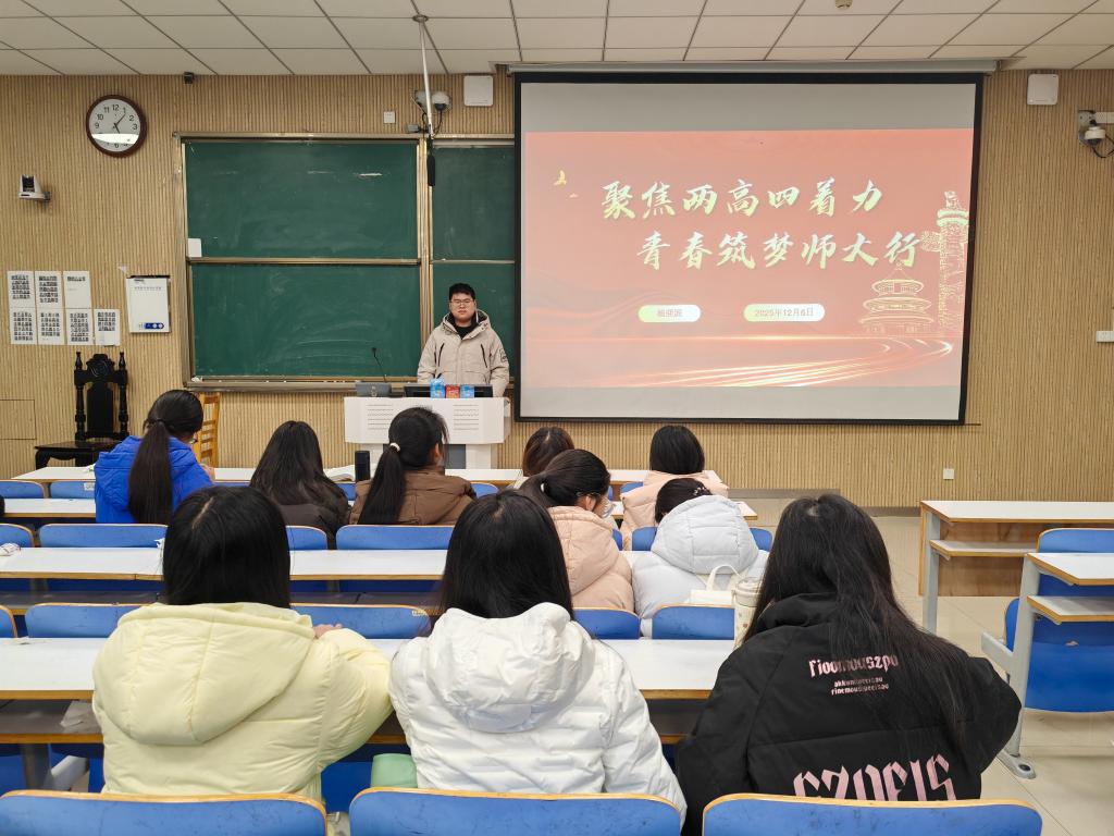 团课伊始,杨迎滨以“何为两高四着力”为切入点,结合高校育人使命与青年成长成才路径,系统阐释了“两高四着力”的核心内涵与实践要求。他强调,“两高”是目标导向,指引青年要树立高标准、追求高质量发展;“四着力”是行动指南,要求青年在理想信念、专业学习、实践创新、服务奉献四个方面下足功夫。他还结合本校优秀校友扎根基层、教书育人的先进事迹,以及学院学子在学科竞赛、志愿服务中的突出表现,生动展现了新时代师大青年践行“两高四着力”的青春风采。在互动交流环节,同学们围绕“如何将个人成长融入学校发展与时代需求”“怎样以实际行动落实‘四着力’要求”等话题踊跃发言。张茵分享道:“作为师范院校的学生,我们要以高标准锤炼教学技能,以高质量夯实专业基础,未来在三尺讲台书写青春担当。”现场讨论气氛热烈,思想的火花在交流中不断碰撞。