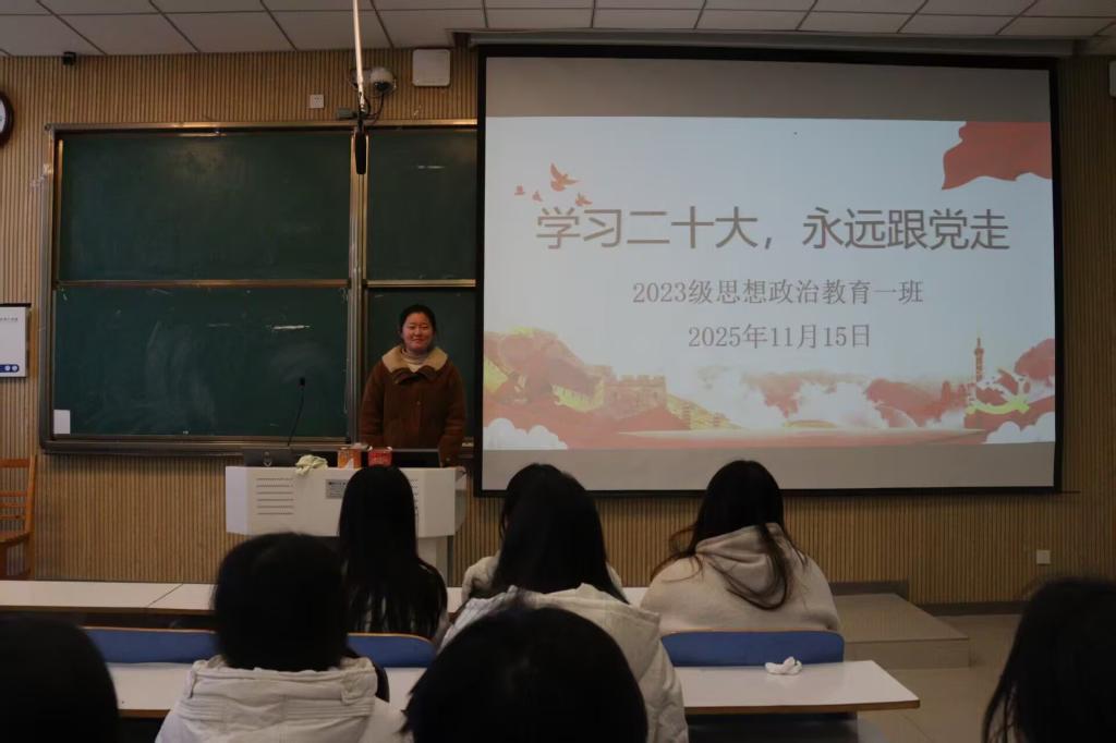 团课伊始,张卓围绕党的二十大报告中关于青年工作的重要论述,强调新时代青年要牢记“坚定不移听党话、跟党走”的重要嘱托。随后,同学们共同观看了主题纪录片《奋进新征程》,从脱贫攻坚、科技创新、生态文明建设等鲜活实践中,直观感受党的二十大以来国家取得的历史性成就。在交流讨论环节,团员代表刘冉分享道:“作为思想政治教育专业的学生,我们更应深耕理论学习,把二十大精神转化为学习动力和行动自觉,未来在教育岗位上传播党的创新理论,以青春之力践行‘永远跟党走’的誓言。”