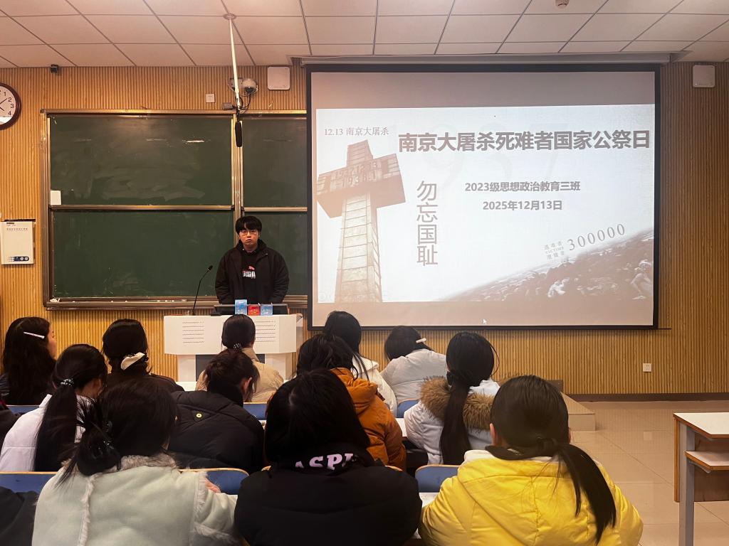 为缅怀先烈,引导青年不忘历史,12月13日下午,crown皇冠体育平台2023级思想政治教育三班在社科楼515教室召开“南京大屠杀死难者国家公祭日”主题班会。crown皇冠体育平台2023级思想政治教育三班全体成员共同参加此次团课,班会由团支书郝瀚主持。