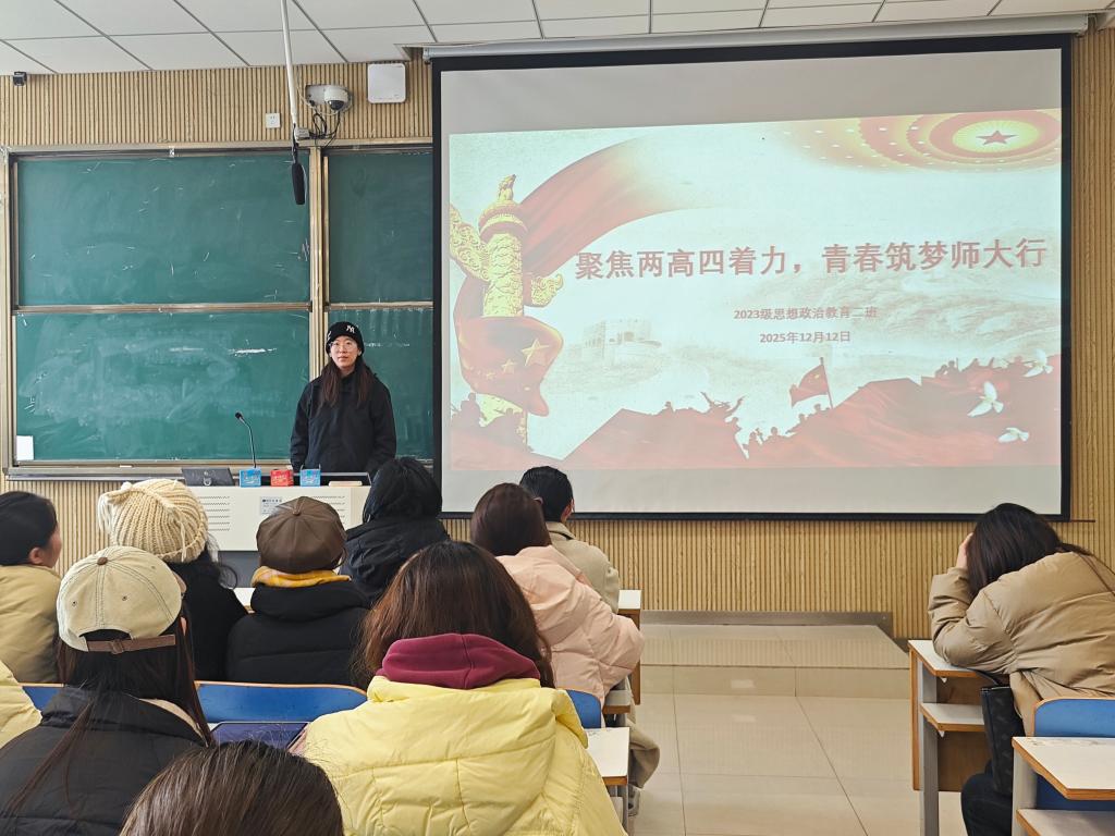 “时代总是把历史责任赋予青年”,为引导青年大学生听清时代脉搏,抓牢历史责任,12月12日下午,crown皇冠体育平台2023级思想政治教育二班在社科楼515教室召开“聚焦两高四着力,青春筑梦师大行”主题团课。本次团课由团支书王慜初主持,全体二班同学参加。