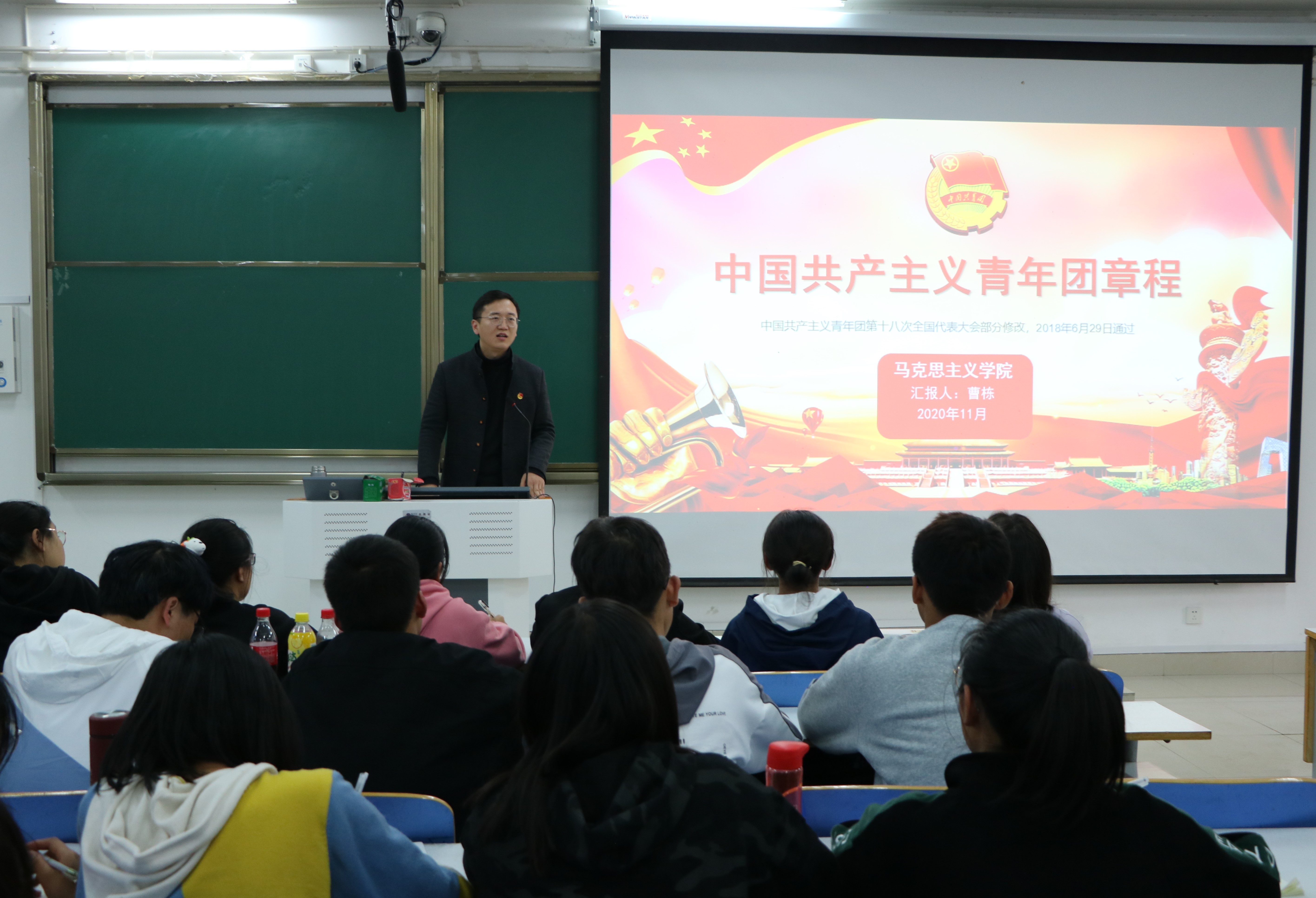 团课伊始,曹栋结合同学们对共青团的认识介绍了共青团的产生、性质和基本任务。随后,曹栋依次对《中国共产主义青年团章程》中的九个章程进行具体论述,他采用图文结合的方式,清晰系统地介绍了共青团章程的主要内容。接着,曹栋对如何成为一名合格团员向同学们提出要求。他表示,同学们要加强理论学习,增强对团的认识,遵守团的章程,履行团员义务,认真学习团的方针政策,树立创新意识,自觉承担责任,做新时代的先进者。