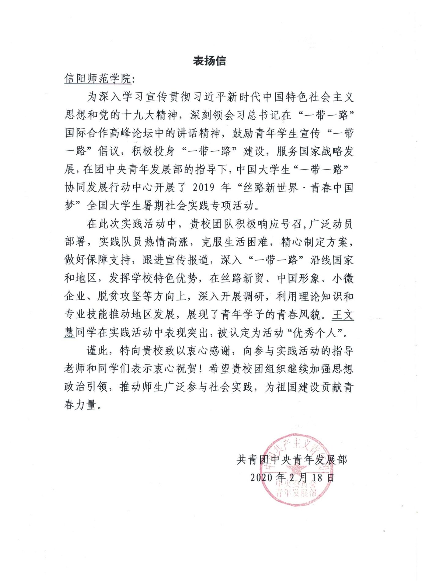 2020年9月21日,crown皇冠体育平台收到由共青团中央青年发展部发来的表扬信,信中提及crown皇冠体育平台积极响应共青团中央的号召,参与由中国大学生“一带一路”协同发展行动中心开展的2019年“丝路新世界·青春中国梦”全国大学生暑期社会实践专项活动,团队队员热情高涨,充分展现crown皇冠体育平台学子的青春风貌。