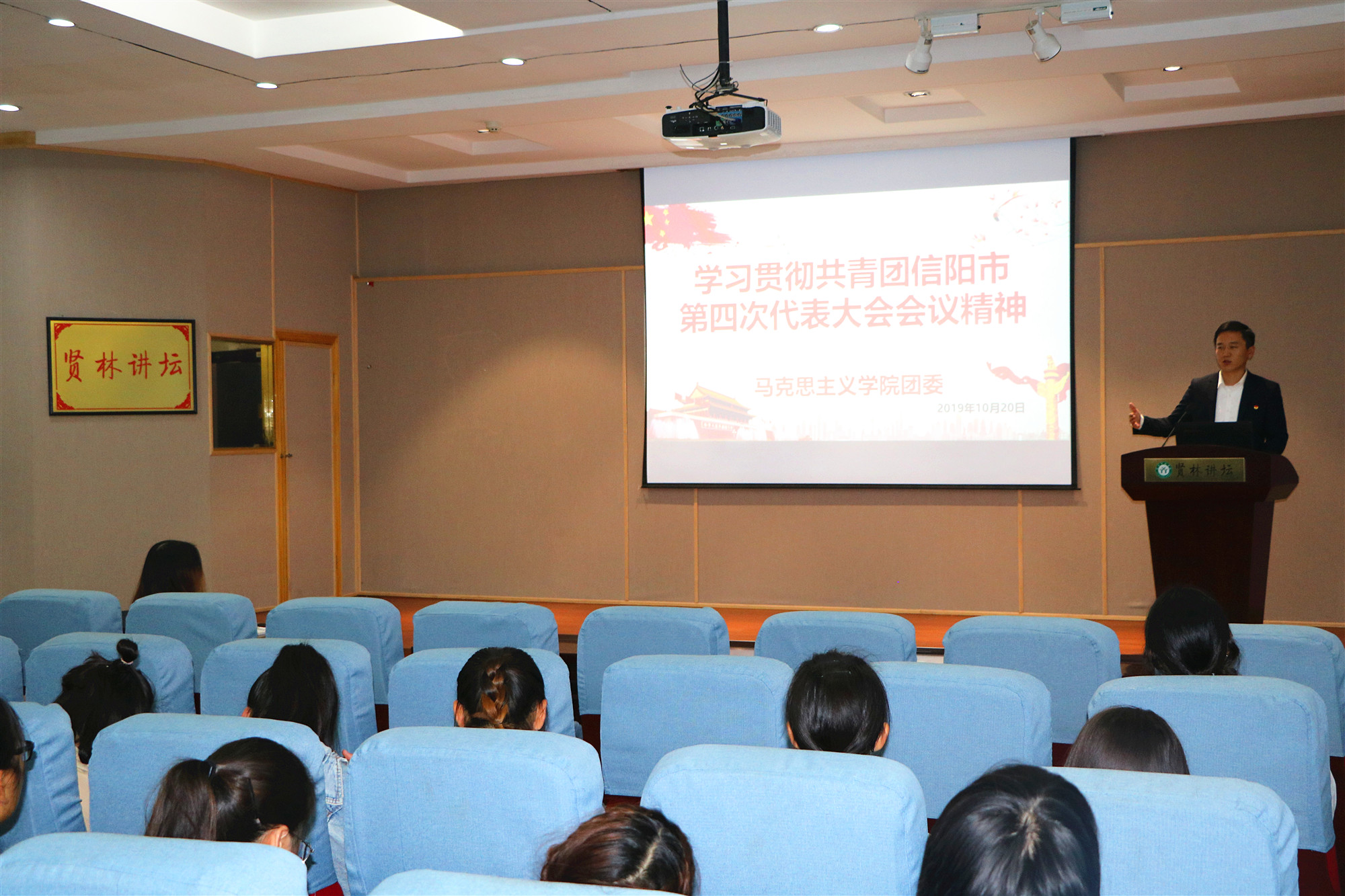为深入学习贯彻落实共青团信阳市第四次代表大会会议精神,10月20日下午,crown皇冠体育平台团委书记曹栋在贤林讲坛为crown皇冠体育平台19级团员青年宣讲共青团信阳市第四次代表大会会议精神。crown皇冠体育平台党委副书记何晓坚、辅导员陶青青及2019级crown皇冠体育平台全体团员青年共同参加了本次会议。