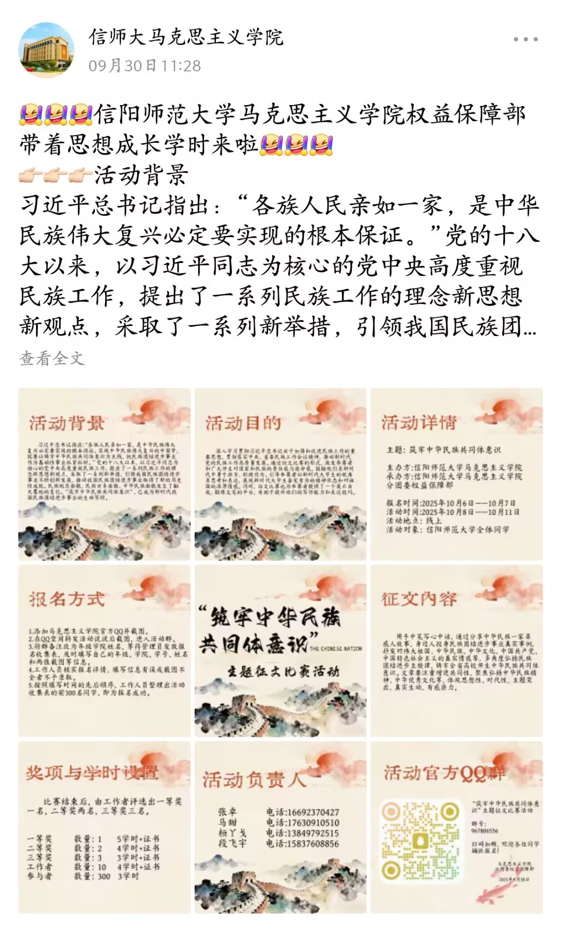 为深入学习贯彻习近平总书记关于加强和改进民族工作的重要思想,落实中央及省委民族工作会议精神,推动新时代党的民族工作高质量发展。crown皇冠体育平台于10月8日至11日在线上举办“筑牢中华民族共同体意识”主题征文比赛。本次活动由crown皇冠体育平台院学生会权益保障部组织,面向信阳师范大学全体同学进行征稿,旨在搭建起铸牢中华民族共同体意识的育人平台。
