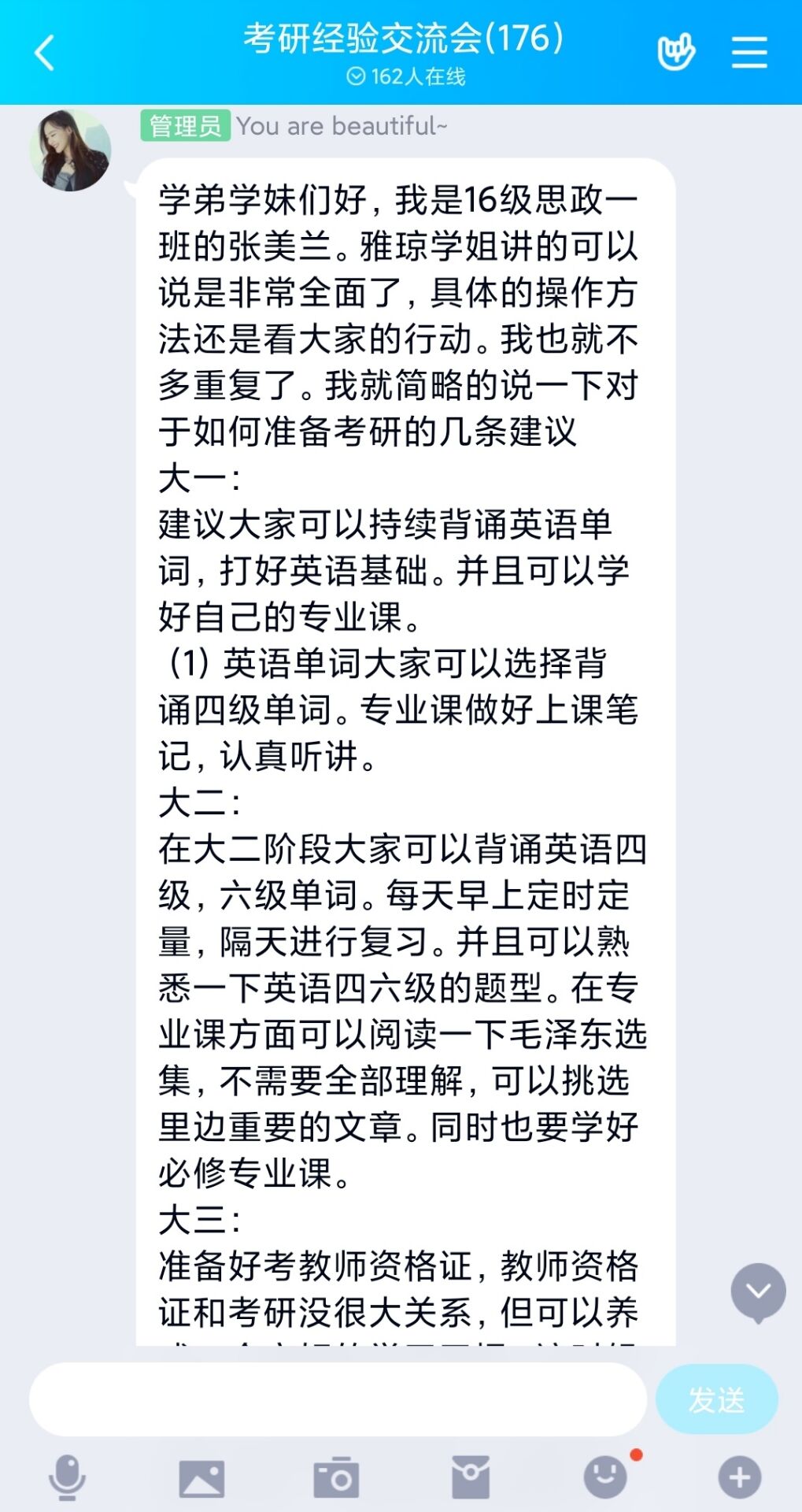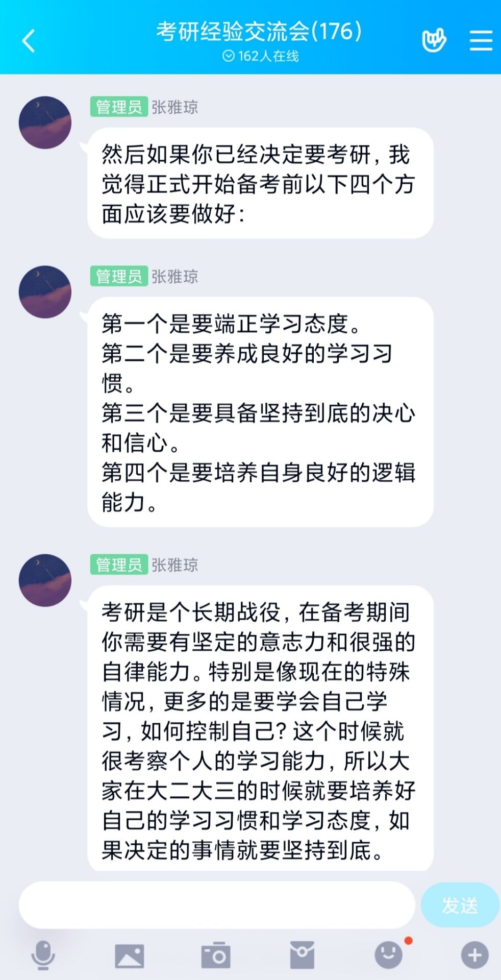 6月11日下午,crown皇冠体育平台考研服务社通过腾讯QQ线上平台举办了“以梦为笔,绘美研途”主题考研经验交流会。crown皇冠体育平台2016级优秀考研学生代表张雅琼、张美兰以及2018、2019级有意向考研的同学共同参加本次交流会。会议由考研服务社牛笑怡主持。