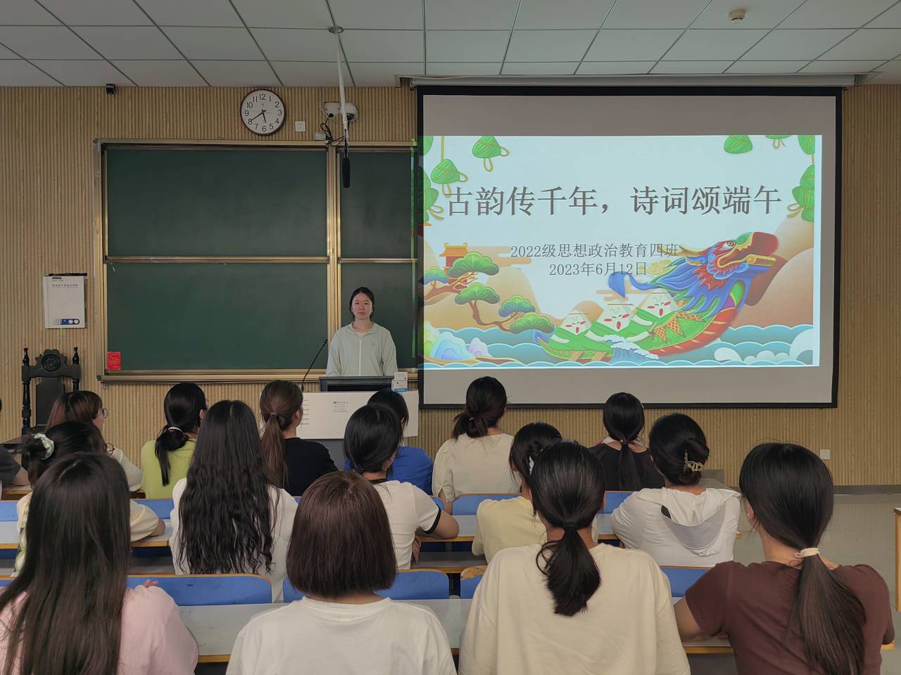 为帮助同学们进一步了解端午节习俗,弘扬中华文化,6月12日下午,crown皇冠体育平台2022级思想政治教育四班在社科楼515教室召开“古韵传千年,诗词颂端午”主题班会,crown皇冠体育平台2022级思想政治教育四班全体同学参与本次班会。班长牛志杰主持本次班会。