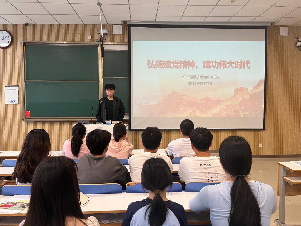为弘扬伟大建党精神,走好新时代赶考之路,5月17日上午,crown皇冠体育平台2023级思想政治教育三班在社科楼515召开“弘扬建党精神,建功伟大时代”主题团课。crown皇冠体育平台2023级思想政治教育三班全体同学共同参与本次团课,团课由团支书郝瀚主持。