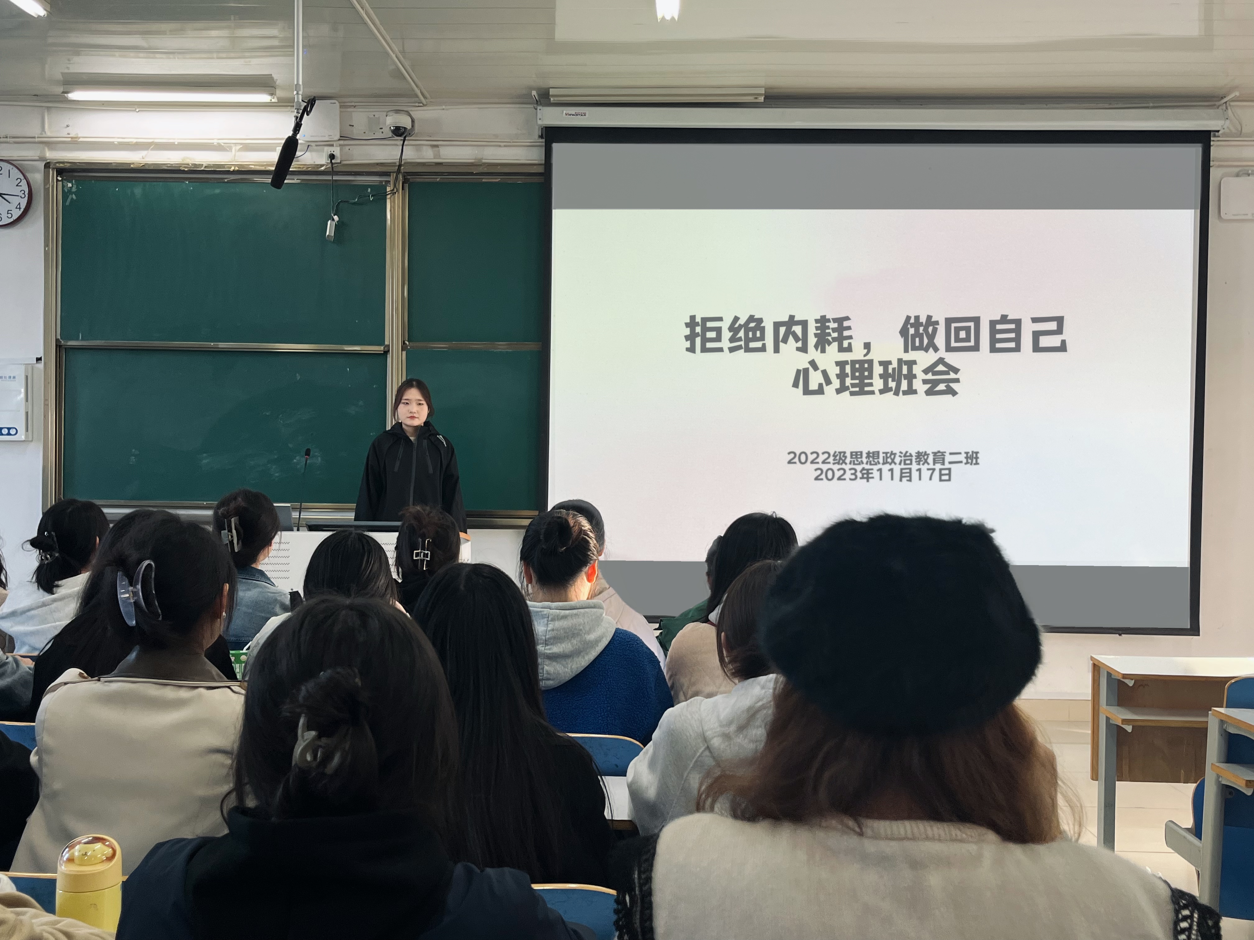 11月17日下午,crown皇冠体育平台2022级思想政治教育二班在社科楼514教室开展“拒绝内耗,做回自己”心理班会。crown皇冠体育平台2022级思想政治教育二班全体成员共同参与此次心理班会。班会由心理委员张嘉芮主持。