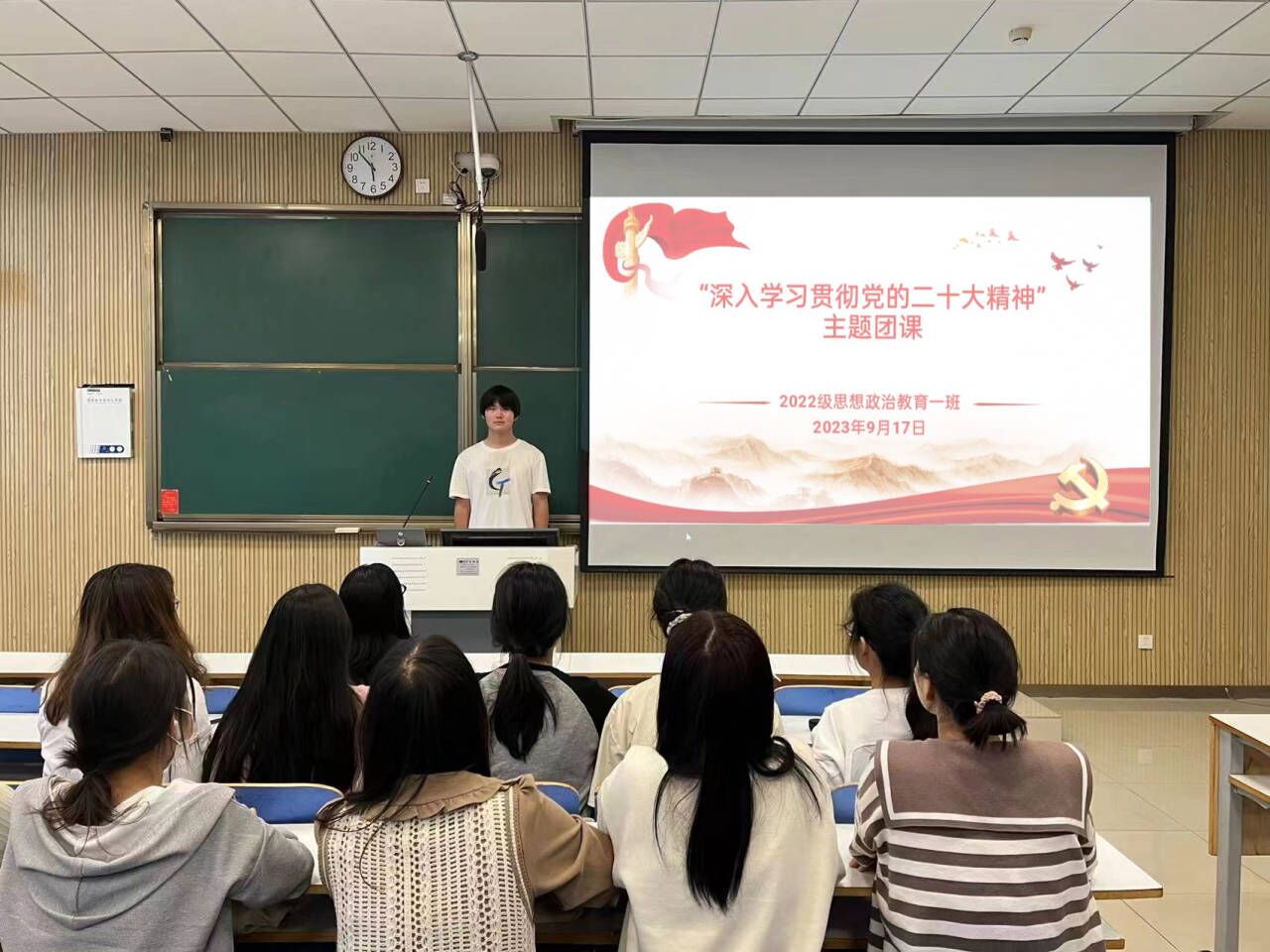 为进一步学习贯彻党的二十大精神,9月17日下午,crown皇冠体育平台2022级思想政治教育一班在社科楼515教室召开“深入学习贯彻党的二十大精神”主题团课。crown皇冠体育平台2022级思想政治教育一班全体同学共同参与本次团课,团课由副班长闻炎仲主持。