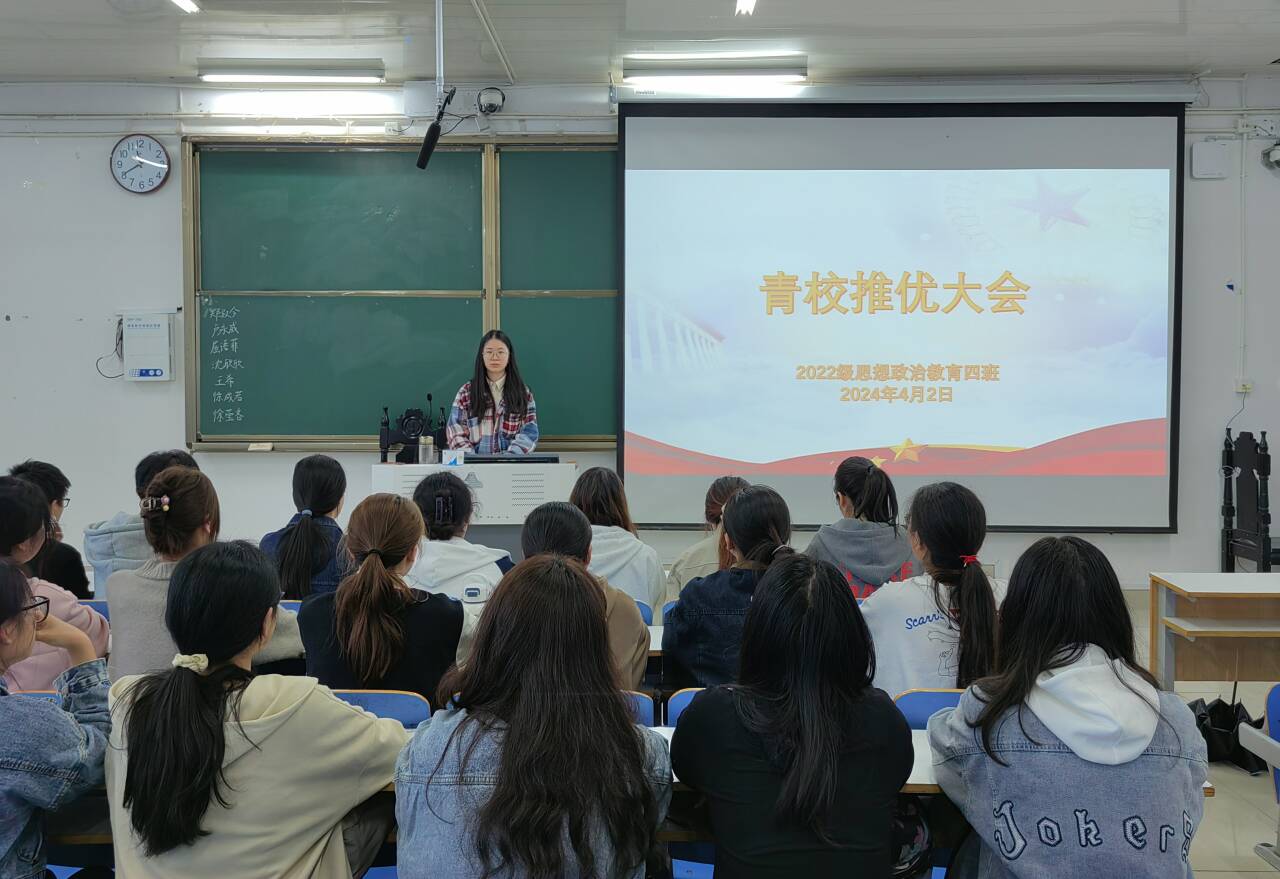 为深入学习贯彻习近平新时代中国特色社会主义思想和党的二十大精神,加强对入党积极分子的教育培养,4月2日上午,crown皇冠体育平台2022级思想政治教育四班在社科楼514教室组织召开青校推优大会。crown皇冠体育平台2022级思想政治教育四班全体成员参与本次班会。本次会议由团支书牛志杰主持。