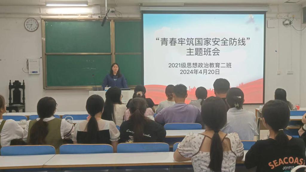 4月20日上午,crown皇冠体育平台2021级思想政治教育二班在社科楼514教室召开“青春牢筑国家安全防线”主题班会。2021级思想政治教育二班全体同学参加此次主题班会。班会由团支书王婧欣主持。